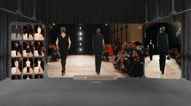 该体验采用Blackmagic URSA Cine Immersive摄像机拍摄,拍摄视角让宾客置身于其中一条T台通道的尽头。模特们径直朝用户走来,然后转身展示服装的剪裁和动态。